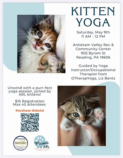 Join us and the Animal Rescue League of Berks County on Saturday, May 9th from 11 AM – 12 PM for Kitten Yoga at Antietam Valley Rec & Community Center with Yoga Instructor/Occupational Therapist from OTherapYoga, Liz Bentz! Unwind with a purr-fect yoga session, joined by playful ARL kittens. The space is limited to 45 attendees.